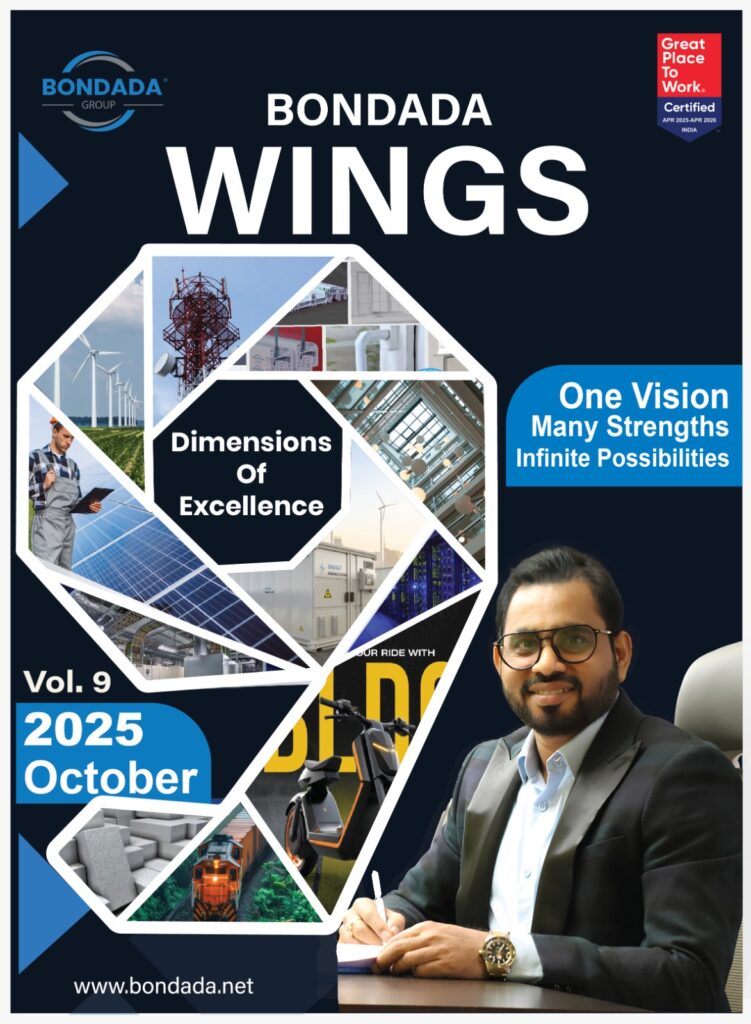 Bondada Wings Volume 9 celebrates the enduring strength that defines Bondada Group, a strength built on innovation, integrity, and unity of purpose. This edition highlights our commitment to advancing Bharat’s progress through excellence in Renewable Energy, Telecom, LED Lighting, Building Materials, and Steel Fabrication, while fostering collaboration and continuous growth.